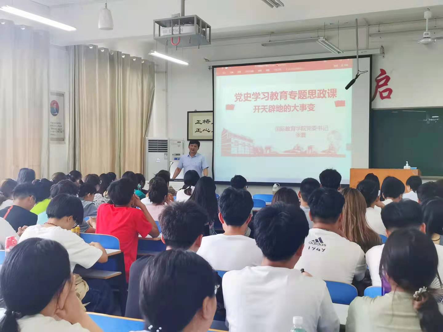 为深入开展党史学习教育、爱国主义教育,推动党史学习走向深处、走进心田、落到实处,引导全院师生学史明理,学史增信,学史崇德,学史力行,为民族复兴伟业固本培元、凝心铸魂,5月31日下午,国际教育学院党委书记张震深入学生课堂,在逸夫楼209教室讲授“开天辟地的大事变”党史学习教育专题思政课。学院辅导员、班主任,2019级生物技术专业全体学生聆听了本次课程。